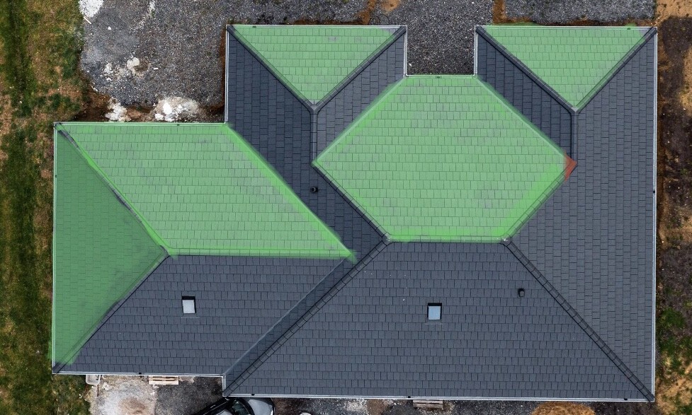Luftaufnahme eines Hauses mit gruenem und dunkelgrauem Ziegendach von oben