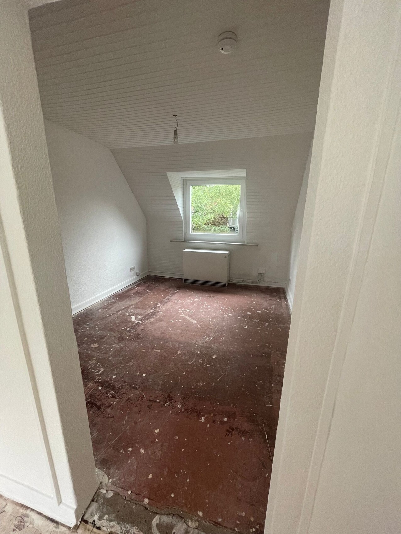 Eine Freundin von mir hat eine Wohnung gefunden. Das Haus ist vielleicht aus den 70er? Die Wohnung ist im Dachgeschoss.