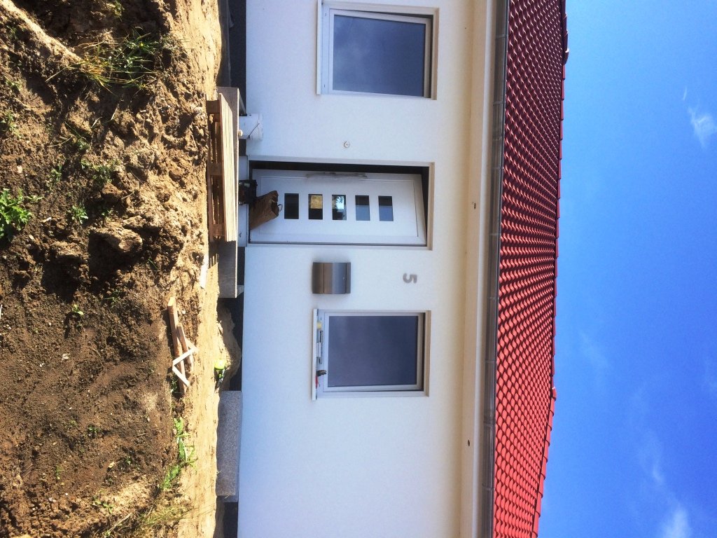 Weiße Hausfront mit Eingangstür, Bauarbeiten im Vordergrund, rotes Dach.