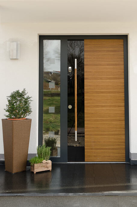 ist evtl. etwas OT aber ich habe letztes Jahr in Nürnberg auf der Consumenta 2015 in der Bau Halle eine Haustüre gesehen, welche vom Grundgerüst eine „normale“ Aluminium Tür in anthrazit war aber seitlich bzw. 2/3 davon echte Eiche bzw. 2-3 Baumscheiben eingelegt hatte. Ich weiß nicht ob Ihr euch das vorstellen könnt. Hatte natürlich auch Bilder gemacht, welche allerdings nicht mehr auffindbar sind. Nun bin ich vorab wieder auf der Suche nach so etwas.