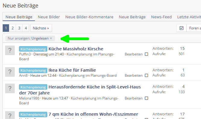 So kann man die schon unterscheiden, aber war das sonst nicht so, dass die nicht in der Liste auftauchten bei den neuen (ungelesenen) Beiträgen?Normal erschienen die nicht in der Liste, man konnte aber mit einem "Filter"-Button oberhalb der Liste auch die schon gesehenen dazuschalten. Beispiel aus einem anderem Forum, das mit derselben Software arbeitet, mit der das Hausbauforum vor dem Relaunch auch gearbeitet hat:
