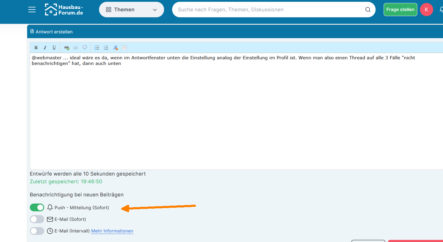 @webmaster ... ideal wäre es da, wenn im Antwortfenster unten die Einstellung analog der Einstellung im Profil ist. Wenn man also einen Thread auf alle 3 Fälle "nicht benachrichtigen" hat, dann auch unten bei orange markiert im Antwortfenster das als Vorgabe. Dann braucht man nur umstellen, wenn man denn doch eine Benachrichtigung will.