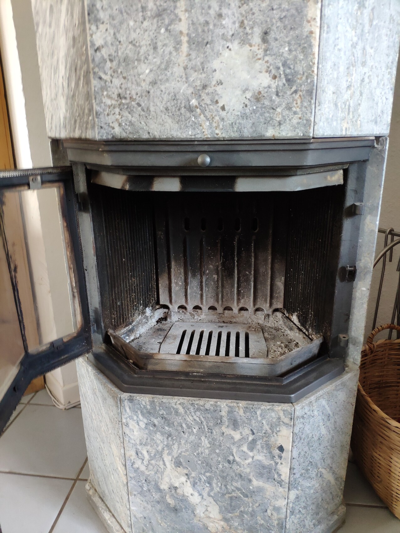 Kaminofen aus grauem Marmor mit offenem Türblatt, Innenrost und Asche.
