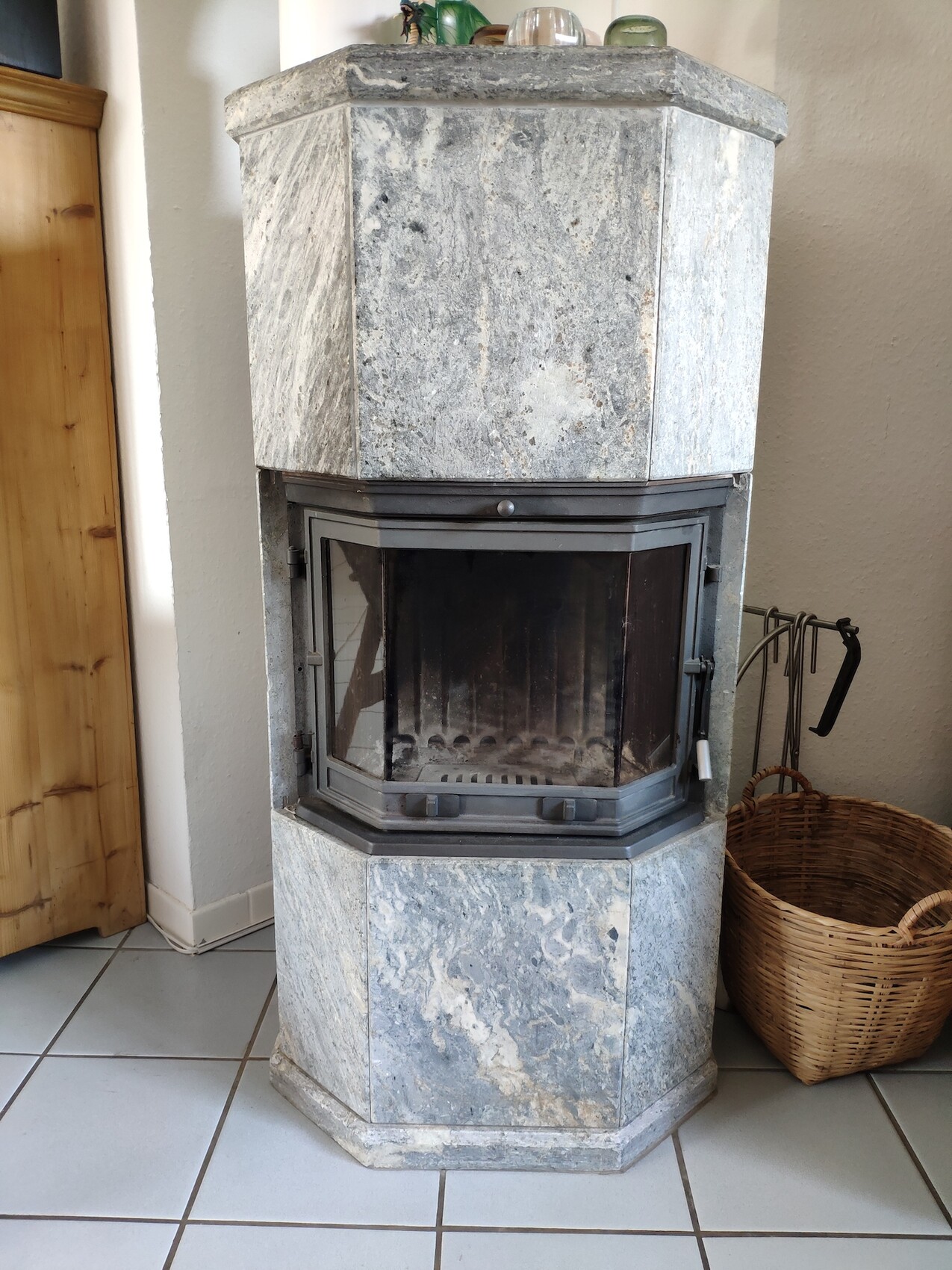 Freistehender Kaminofen aus grauem Stein mit Glasfront; daneben ein Holzkorb.