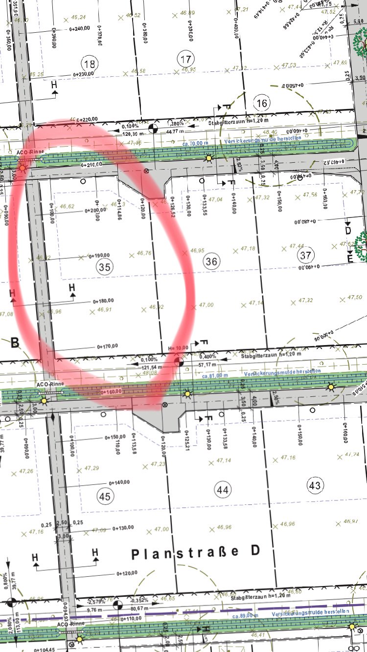 Lage: In einem Neubaugebiet, frisch erschlossen (Baugrundgutachten waren vor Kauf vorhanden und durch Architekt geprüft worden), befindet sich unser Grundstück am Ende einer Stichstrasse (3 Gunsstucke insgesamt in der Stichstrasse, 115 im Baugebiet). Als letztes in der Stichstrasse haben wir auch die tiefste Lage, etwa 0,5m tiefer als der Erste laut Lageplan).