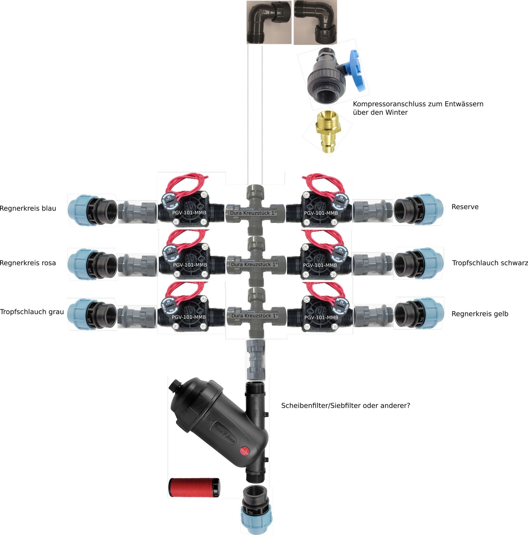 Ich würde vor dem Y-Filter noch einen Absperrhahn einplanen. Bei mir ist die Pumpe etwas von der Ventilbox entfernt, da war es öfter praktisch, kurz den Durchfluss zu sperren ohne die Pumpe ausschalten zu müssen.