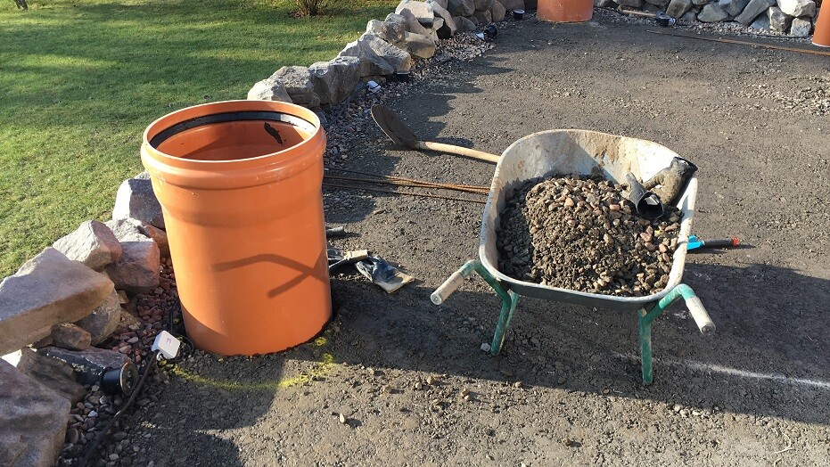 Drumherum haben wir eine Natursteinmauer trocken gemauert, auf einem 40cm tiefen Kiesfundament lagernd.