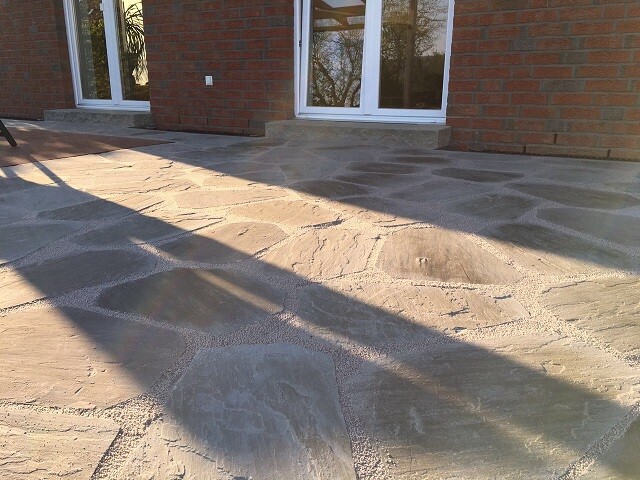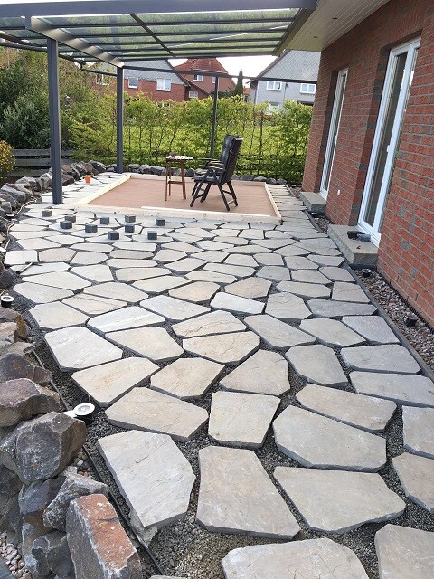 Drumherum 35mm starke Nandi Polygonalplatten, frisch in frisch in eine 60mm dicke Schicht aus Trass-Drain-Mörtel.