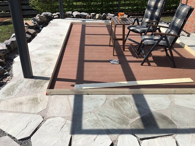 Darauf eine 12m2 große Fläche aus BiWood BPC Volldiele (auf ca. 100 Betonplatten).