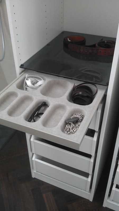 Als "Innenausstattung" haben beide je 4 Komplement-Schubladen mit Vollauszug sowie je eine Komplement-Kleiderstange, einen Komplement-Glaseinlegeboden und je einen dieser superpraktischen Filz-Aufbewahrungsauszüge für Gürtel, Manschettenknöpfe u.ä., die nicht mehr bei IKEA verkauft werden - schaut euch einfach die Bilder an 🙂