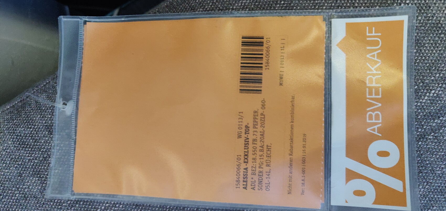 Kartenhülle aus Kunststoff mit orangefarbenem Etikett und Barcode, ABVERKAUF-Aufdruck.