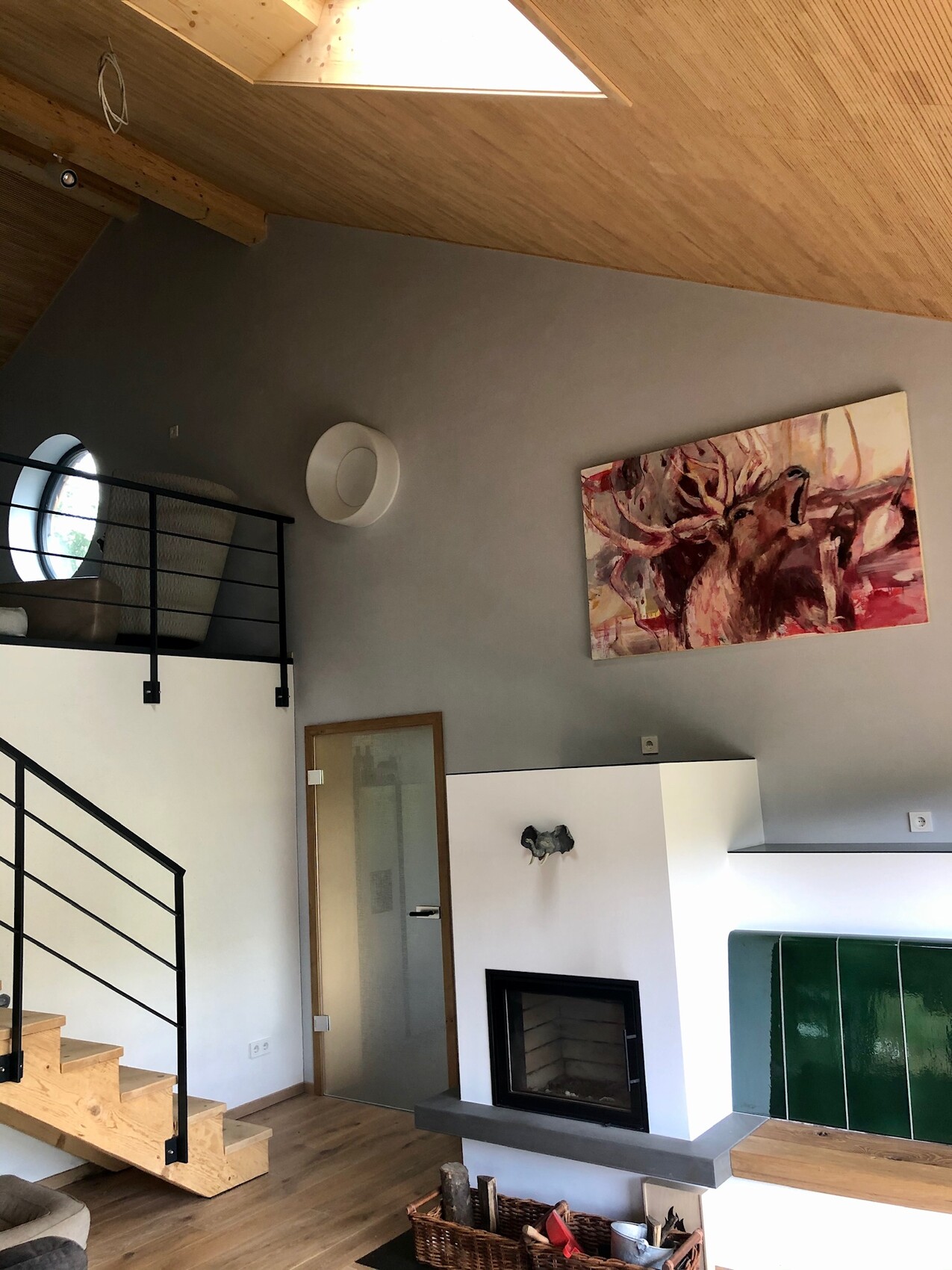 Die unten abgebildete Türe ist 2,11 hoch, die Deckenhöhe locker über 5m an dieser Stelle. Wir finden das passend.