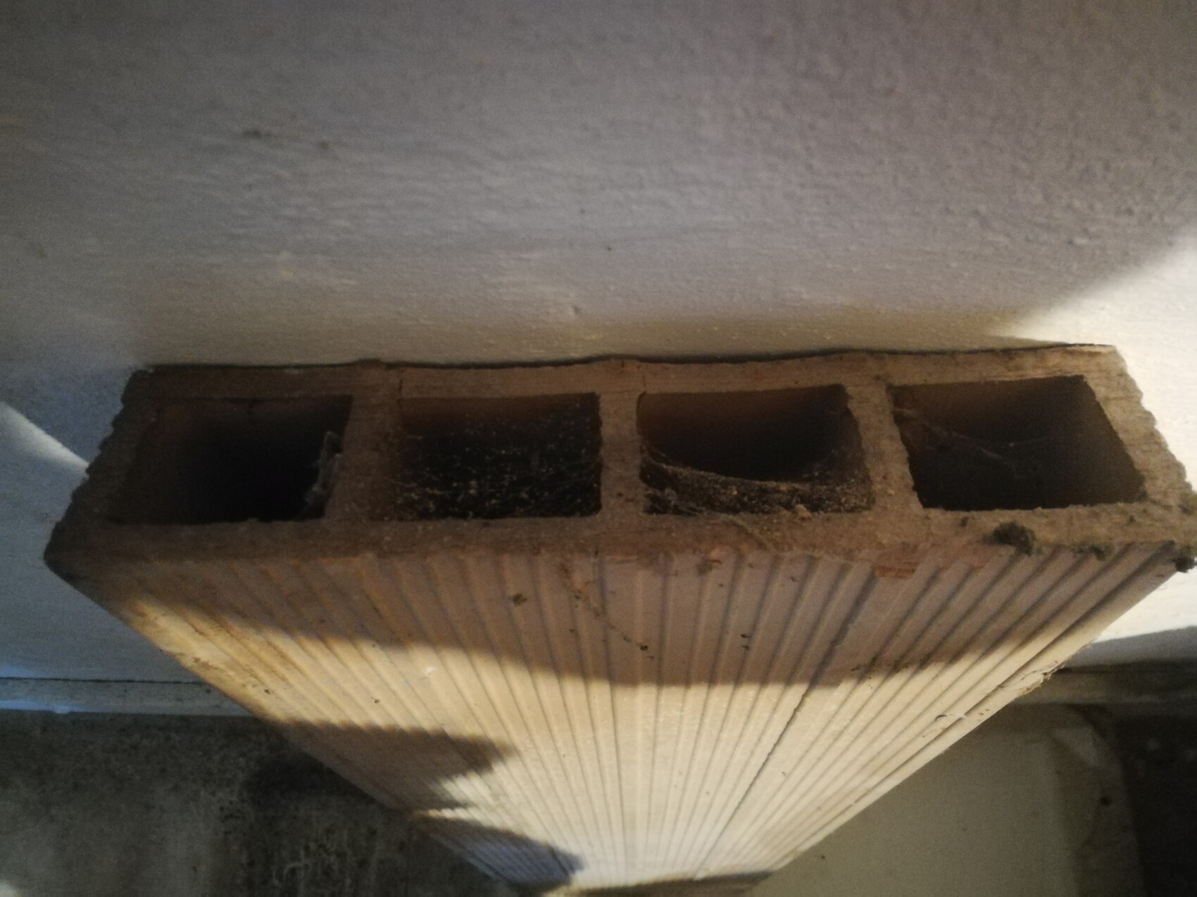 Was die Tonziegel-Elemente angeht, würde ich vermuten, dass diese als eine Art verlorene Schaltung eingebaut wurden. Oben wurde eine bewährte Betondecke drauf gegossen. Diese sollte dann alle statischen Funktionen erfüllen. Die Tonziegel mit den Rissen tragen jedenfalls nichts mehr, sind ja komplett durchgebrochen.
