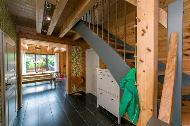 Und vom EG ins OG haben wir eine freitragende massive geölte Buchenholztreppe. Der Aufpreis zu Eiche war uns dann auch zu heftig. Hier finde ich das Holz perfekt und sehr wohnlich.