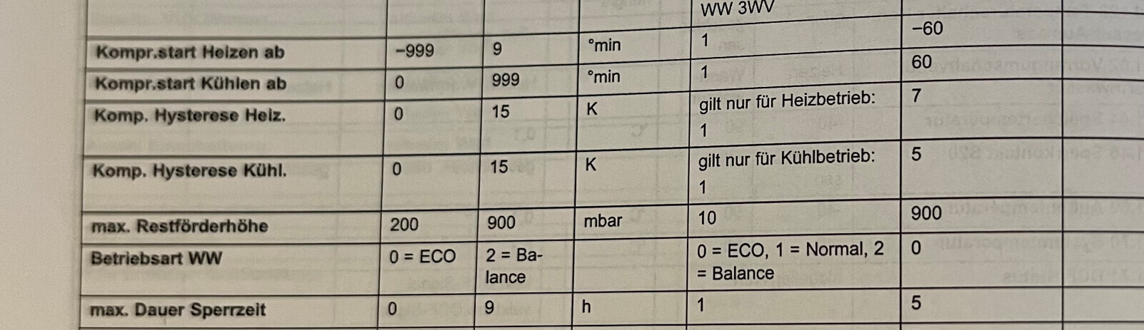 Technische Tabelle mit Komp.start Heiz/Kühl, Hysterese, Restförderhöhe und Betriebsart WW