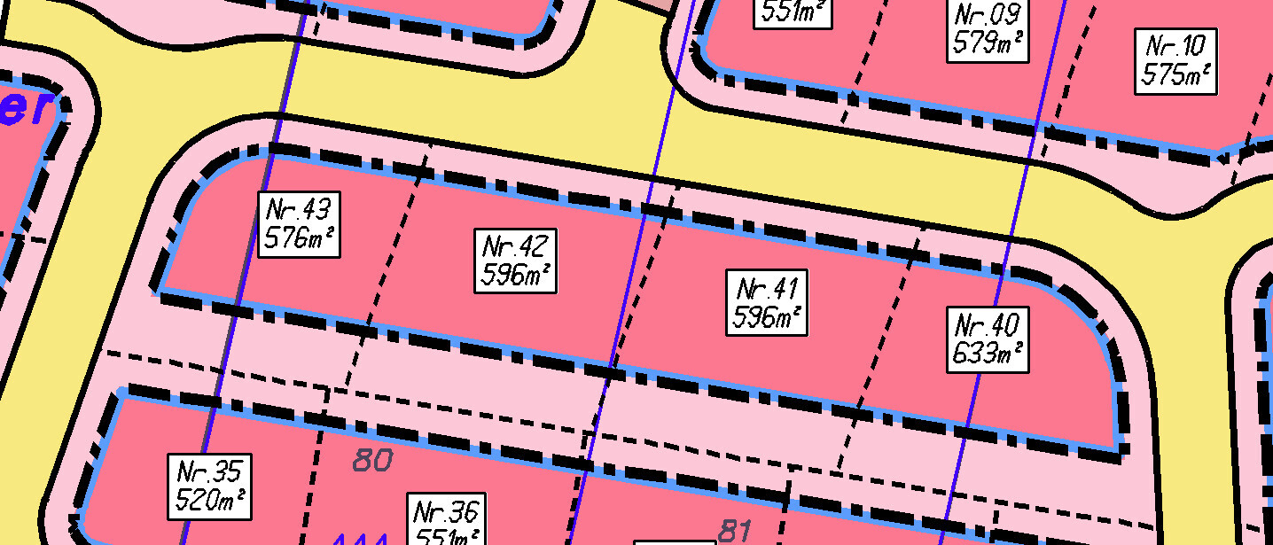 Als Vorteil von 41/42: Nur Strasse im Norden, mehr Spielraum für die Positionierung von Haus und Garage.