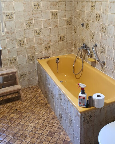 Gelbe Badewanne in beige gefliestem Bad, Reinigungsmittel, Toilettenpapier und Holzbank.