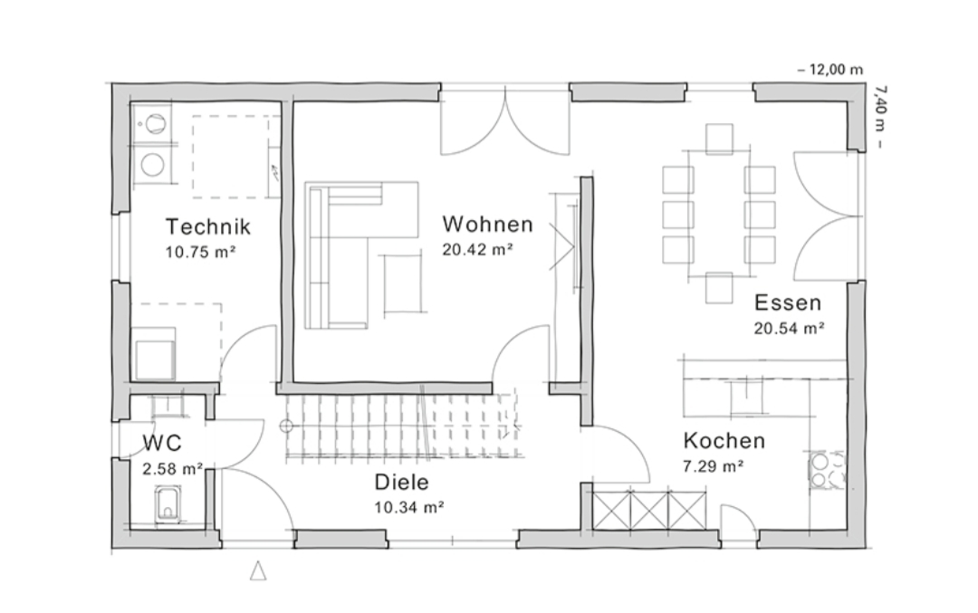 1 zu 1 wird sich das bei uns so eh nicht verwirklichen lassen. 7,40m sind zu breit.Die Wände schauen recht dick aus. Nehmen wir mal als Beispiel 48 cm. Schaffst du nun 31 cm (Massiv 17 cm Kalksandstein plus 12 Dämmung und 2 Putz) so wären es nur noch 7,06 m bei identischem Innenraum.Sich mit den unterschiedlichen Formen des Wandaufbaus von Herstellern zu beschäftigen lohnt also!