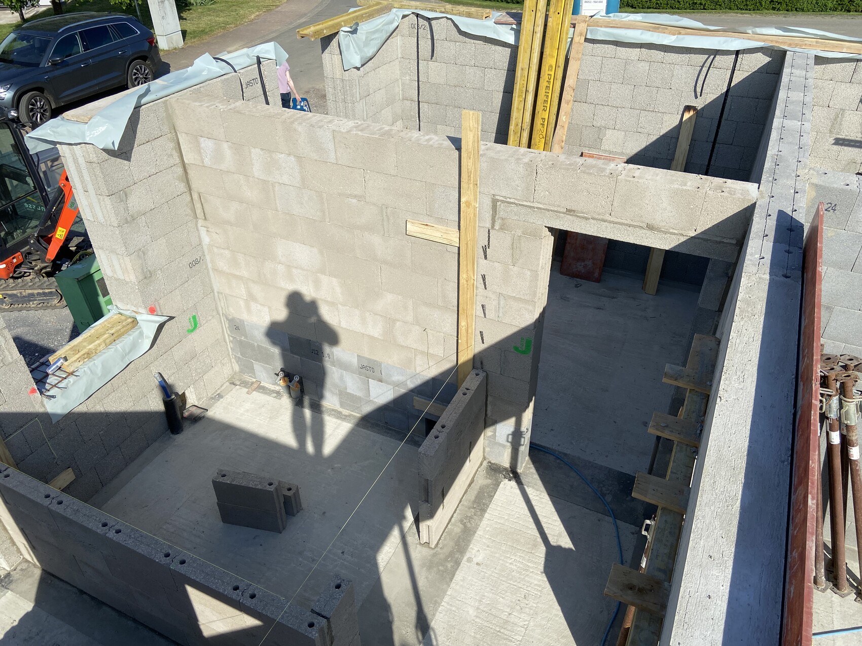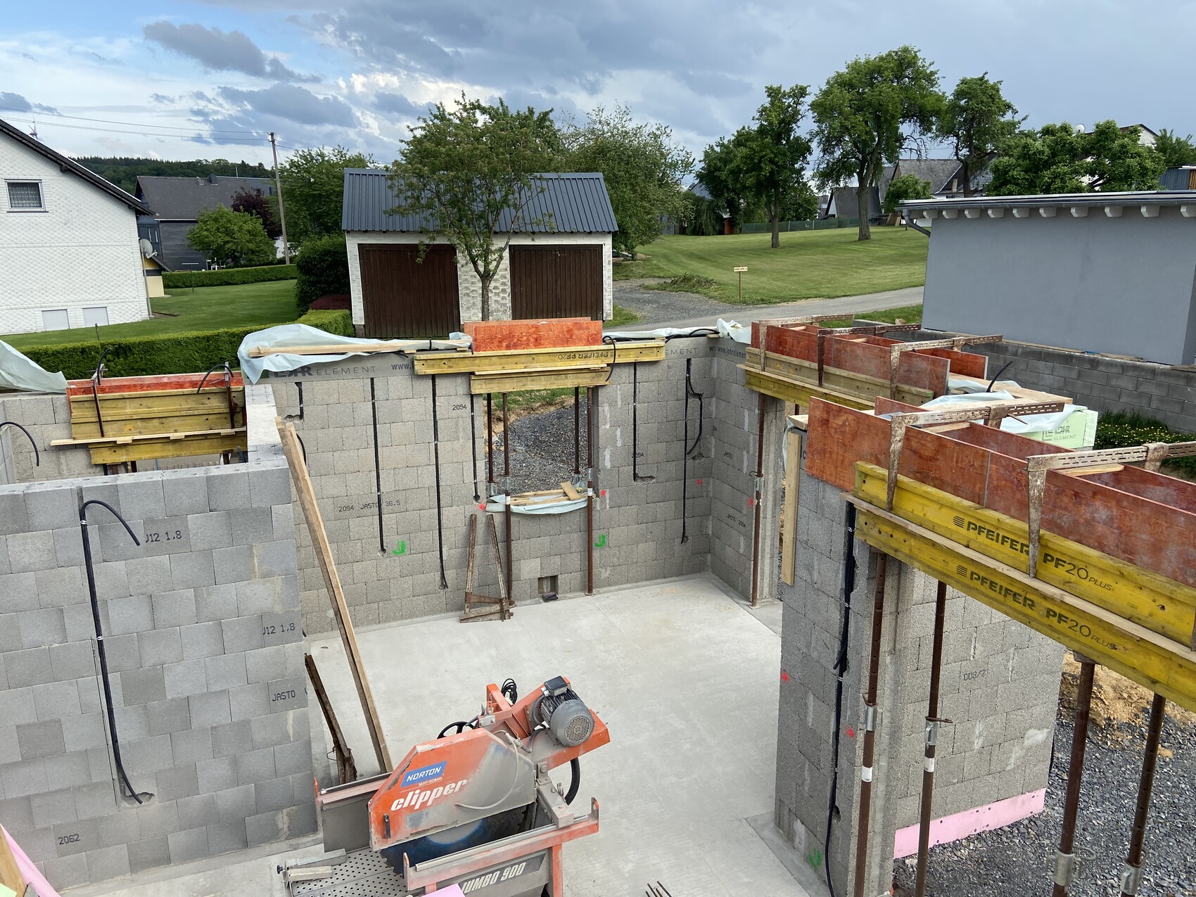 Rohbau-Baustelle mit Betonblockwänden, Holzstützen und Baugeräten