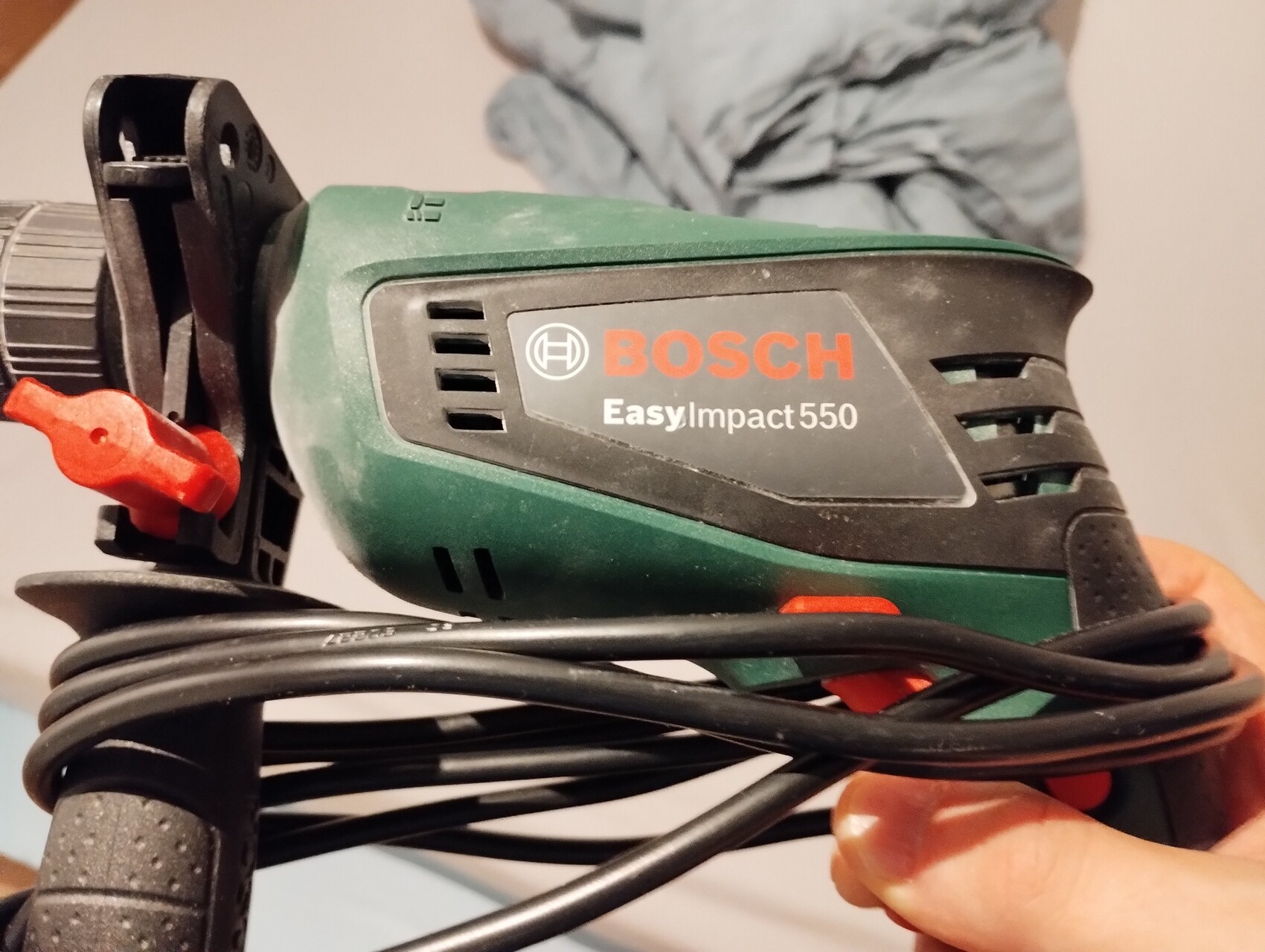 Bosch EasyImpact 550 Bohrhammer, grün-schwarz, mit Kabelwicklung um das Gerät.