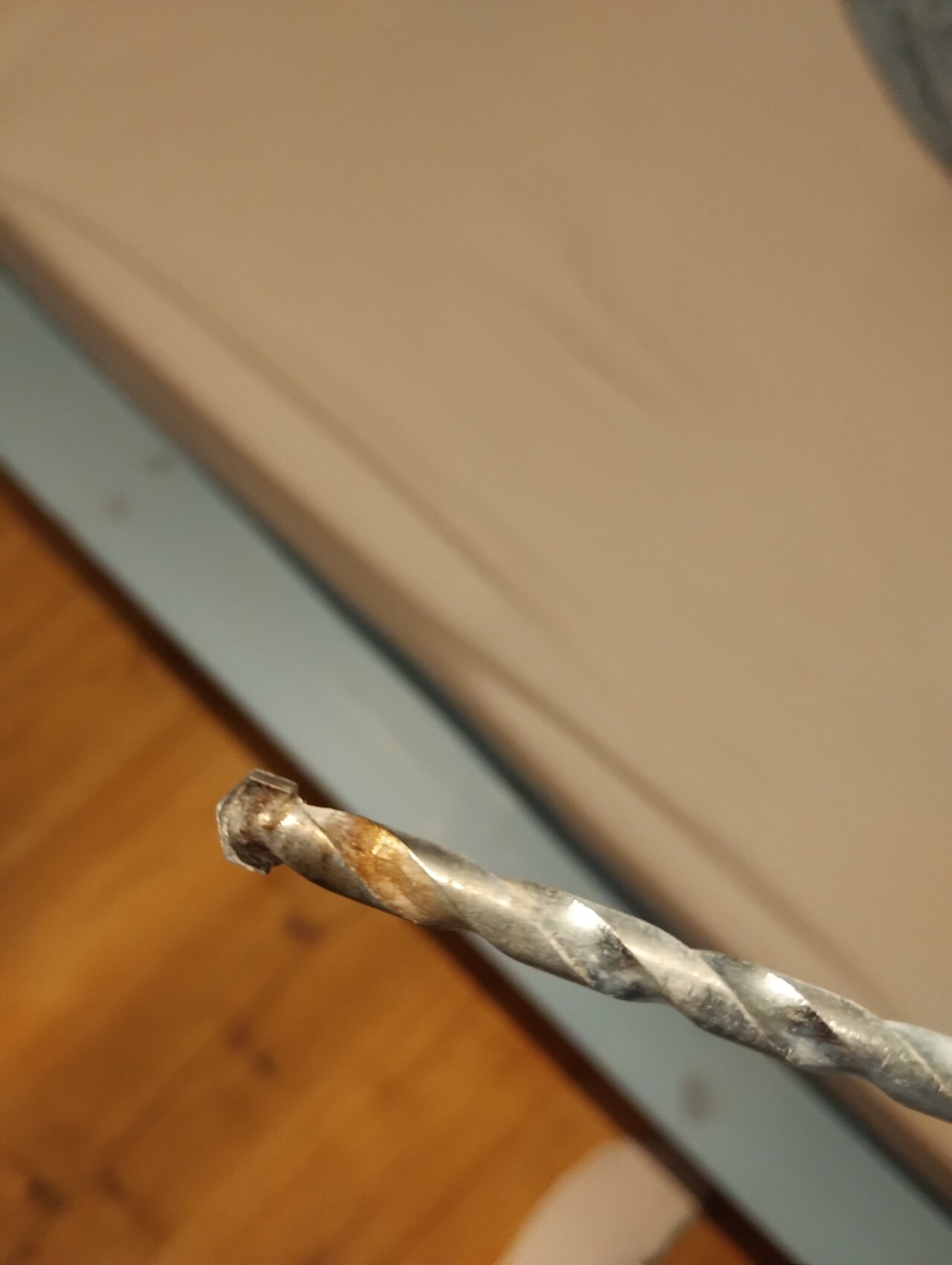 Nahaufnahme eines rostigen Spiralbohrers vor Holzboden im Hintergrund.