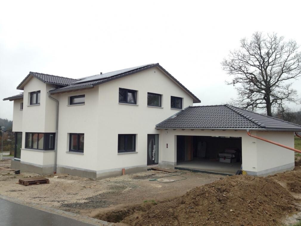 Außenansicht eines Neubaus mit Garage, weiße Fassade und dunklem Ziegeldach