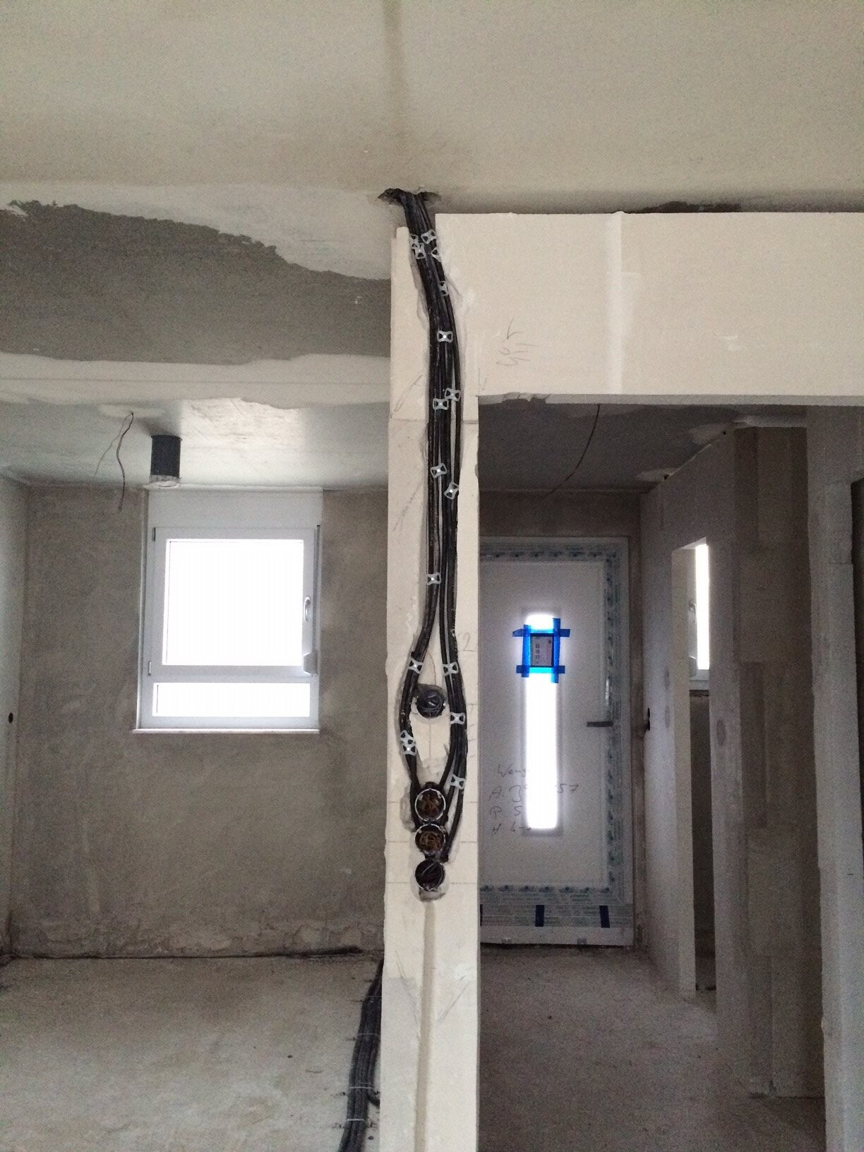 Elektroinstallation, man sollte meinen das Elektrofachkräfte mit einem vermeintlich erlernten Beruf und damit einher gehender Qualifikation das Hightech Gerät die Lochfräse oder auch Bohrkrone schon mal gesehen haben. Gibt es im Baumarkt für durchschnittlich 15,- Euro. Man könnte meinen das ist bei einem Neubau für 300tsd. Euro im Budget noch drin. Im normalen Leben schon, aber nicht bei Wengerter. Es reicht doch vollkommen aus wenn man einen Bohrhammer mit Meißel hat und so lange auf dem Poroton rumwürgt bis das Kabel und ie Dose irgendwie in die Wand passt. Blöd ist nur wenn man nur 9 cm dicke Poroton Steine als Zwischenwände verbaut und die Fachkraft so lange darauf hämmert bis die 9 cm durch sind. Ergebnisse auf den Bildern anbei .... und das waren noch lange nicht alle (Steck-) Dosen die verbaut wurden.
