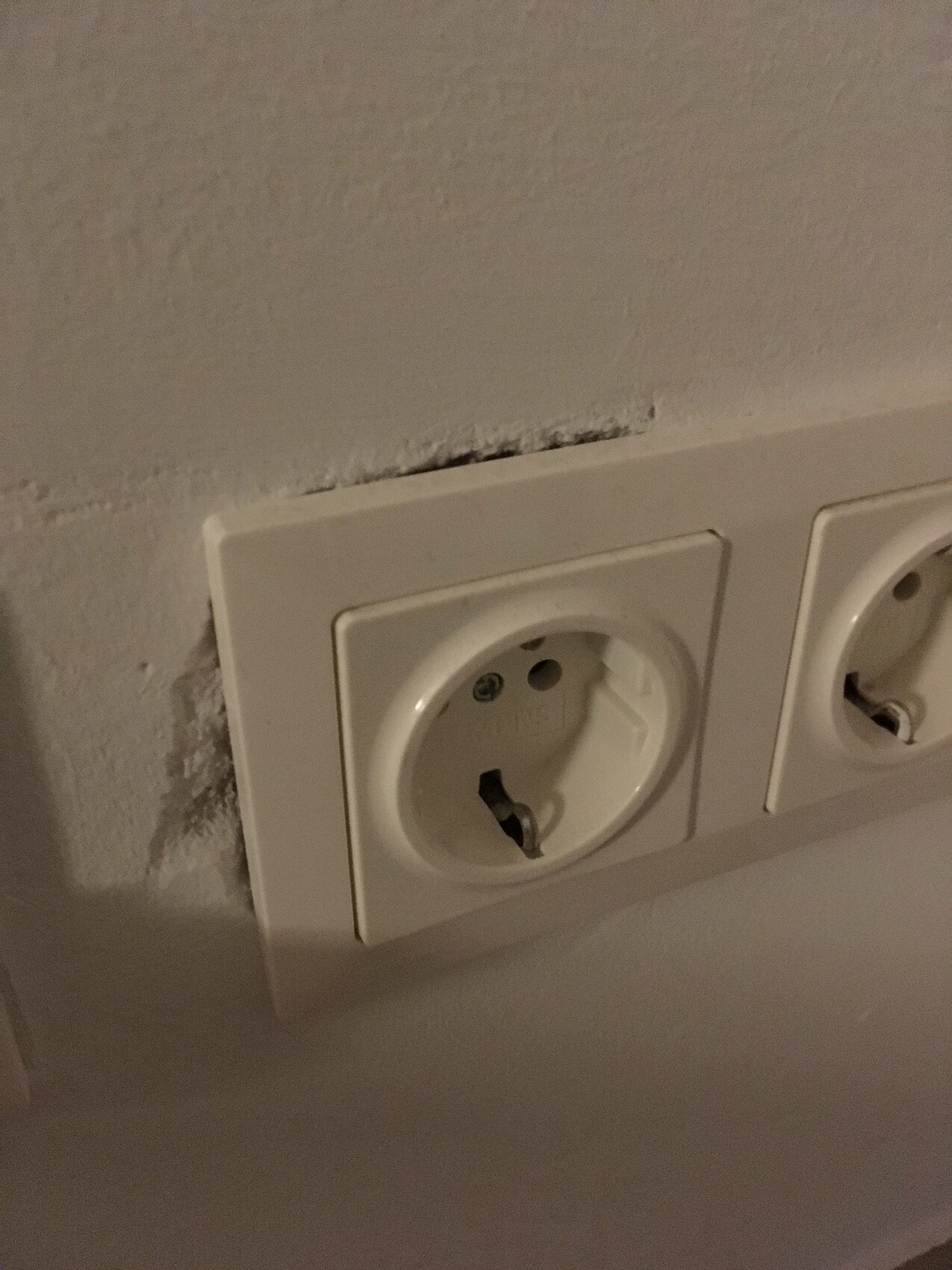 Führt dann am Ende, abgesehen von irgendwelchen mit Gips zugeschmierten Kabellöchern, die mit Grund für die schlechten Putzarbeiten waren, weil danach natürlich nicht sauber verspachtelt und verschliffen, zum dem negativen Endeffekt das die Steckdosen und Schalterblenden die Beschädigungen in der Wand am Ende nicht mehr 100% abdecken (letztes Bild).