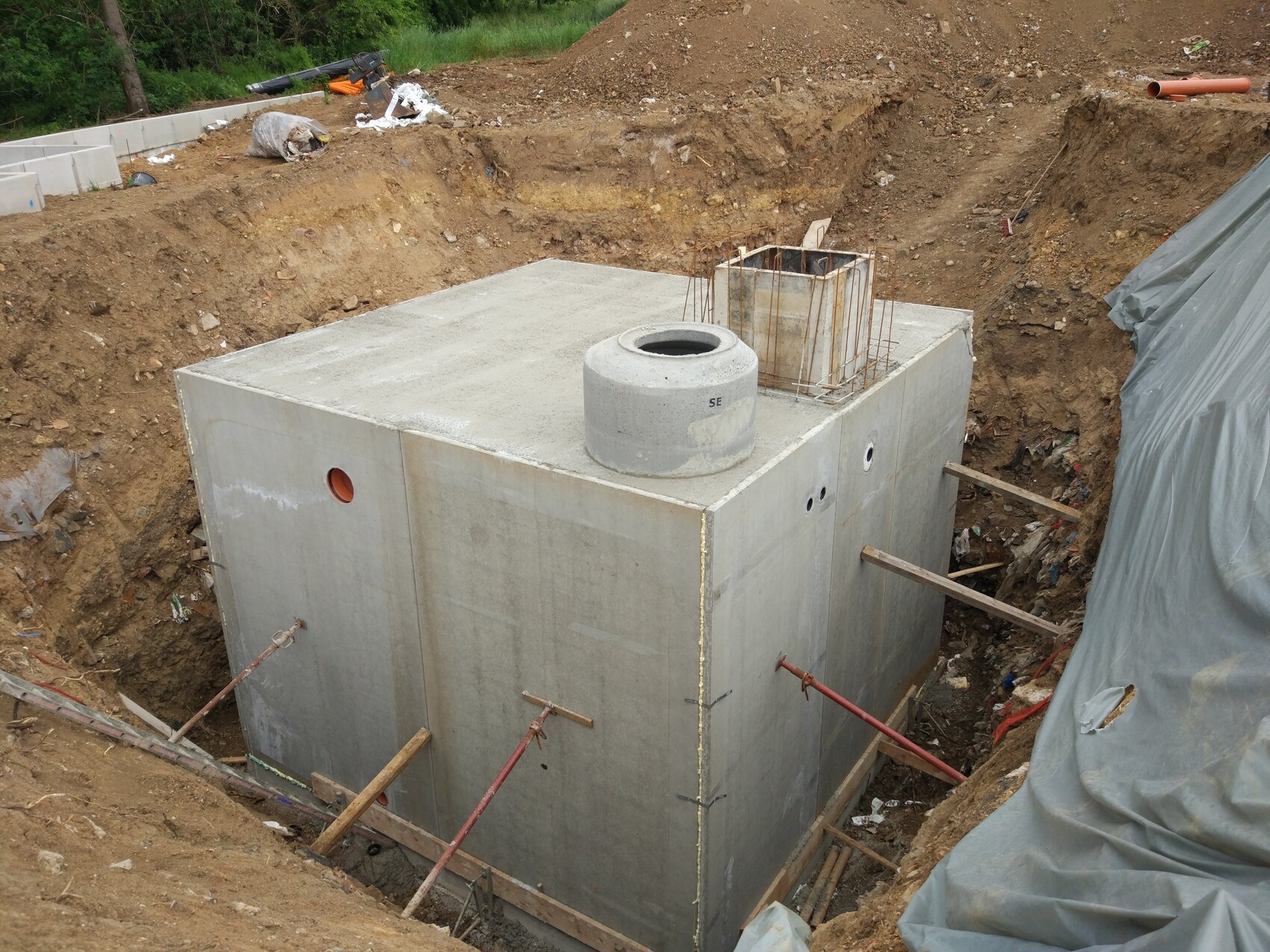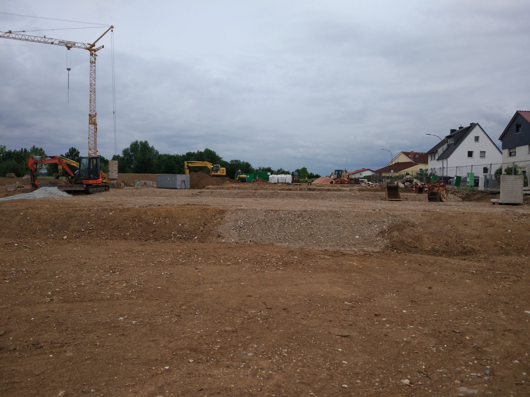 - Aufgrund der Auflage durch die Gemeinde muss ein Rückhaltebecken für Regenwasser gebaut werden. Dies befindet sich dann unter der Straße im Bereich östlich der Heizzentrale. Ich schätze das Fassungsvermögen auf ca. 200 m³.