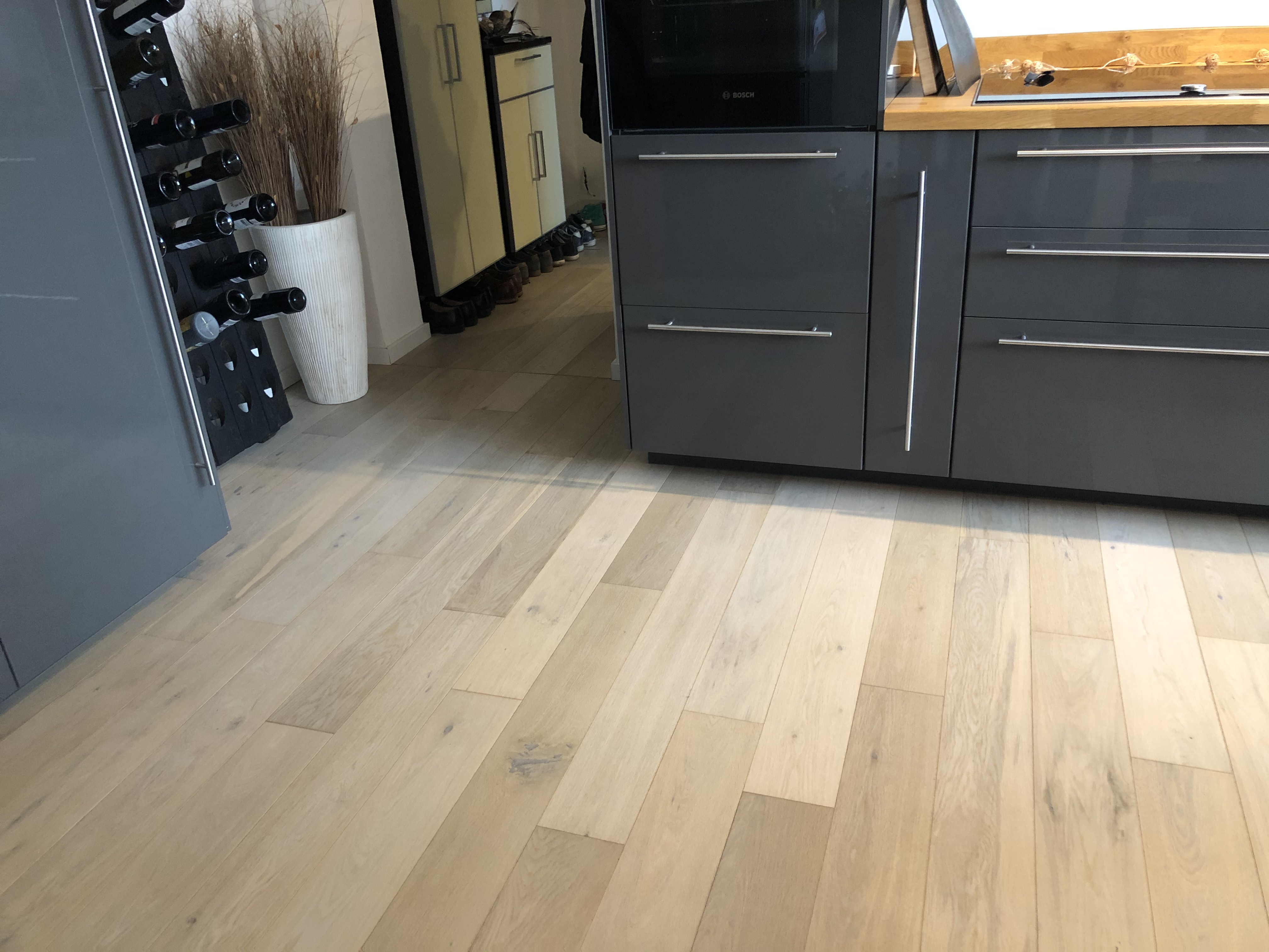 Wir kochen relativ viel und eher expressiv. In der aktuellen (Miet)Wohnung liegt Parkett in der Küche und wir waren sehr skeptisch. Haben einige Macken drin, sonst sieht man die Laufspuren, usw.