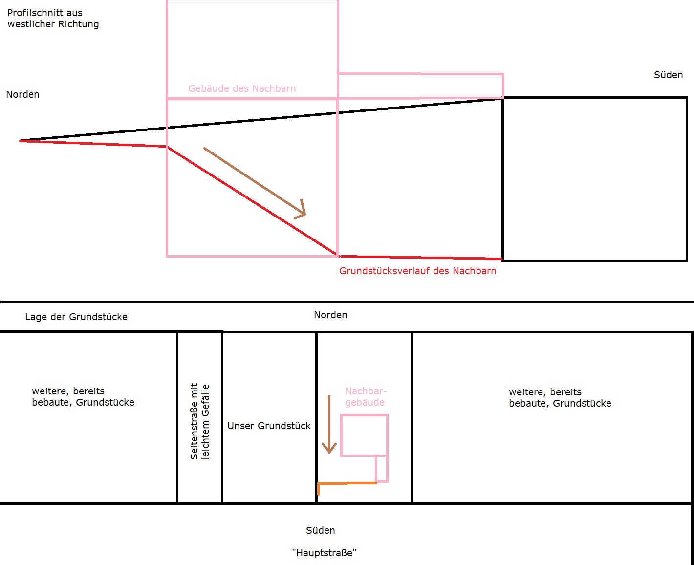 Wie im Profilschnitt zu erkennen, weißt das Grundstück meines Nachbarn ein starkes Gefälle an der Grundstücksgrenze zu meinem Grundstück auf (roter Verlauf). Ich möchte mein Grundstück an den Verlauf der Seitenstraße anfüllen (baue mit Keller und einer Terrasse im Norden, aber hierzu werde ich selber eine Stützwand bauen, der Nachbar hat hiermit nichts zu tun). Mein Grundstück wird also so hoch sein, wie die angrenzenden Straßen.