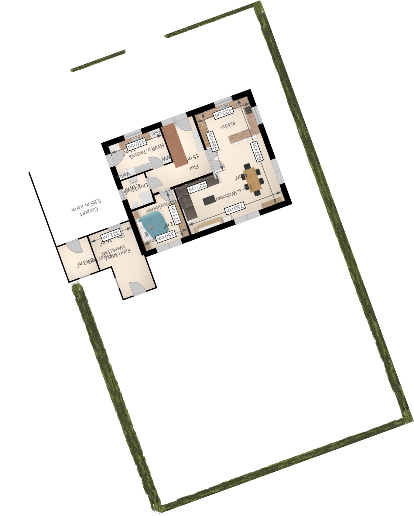 Ich würde bei Haus längs den Carport mit Raum sogar direkt an die westliche Grundstücksgrenze setzen ... und für den Abstellbereich auch einen Zugang von Straßenseite vorsehen ... so kann man Fahrräder am autoschonendsten und bequemer in ihren Abstellbereich bringen.