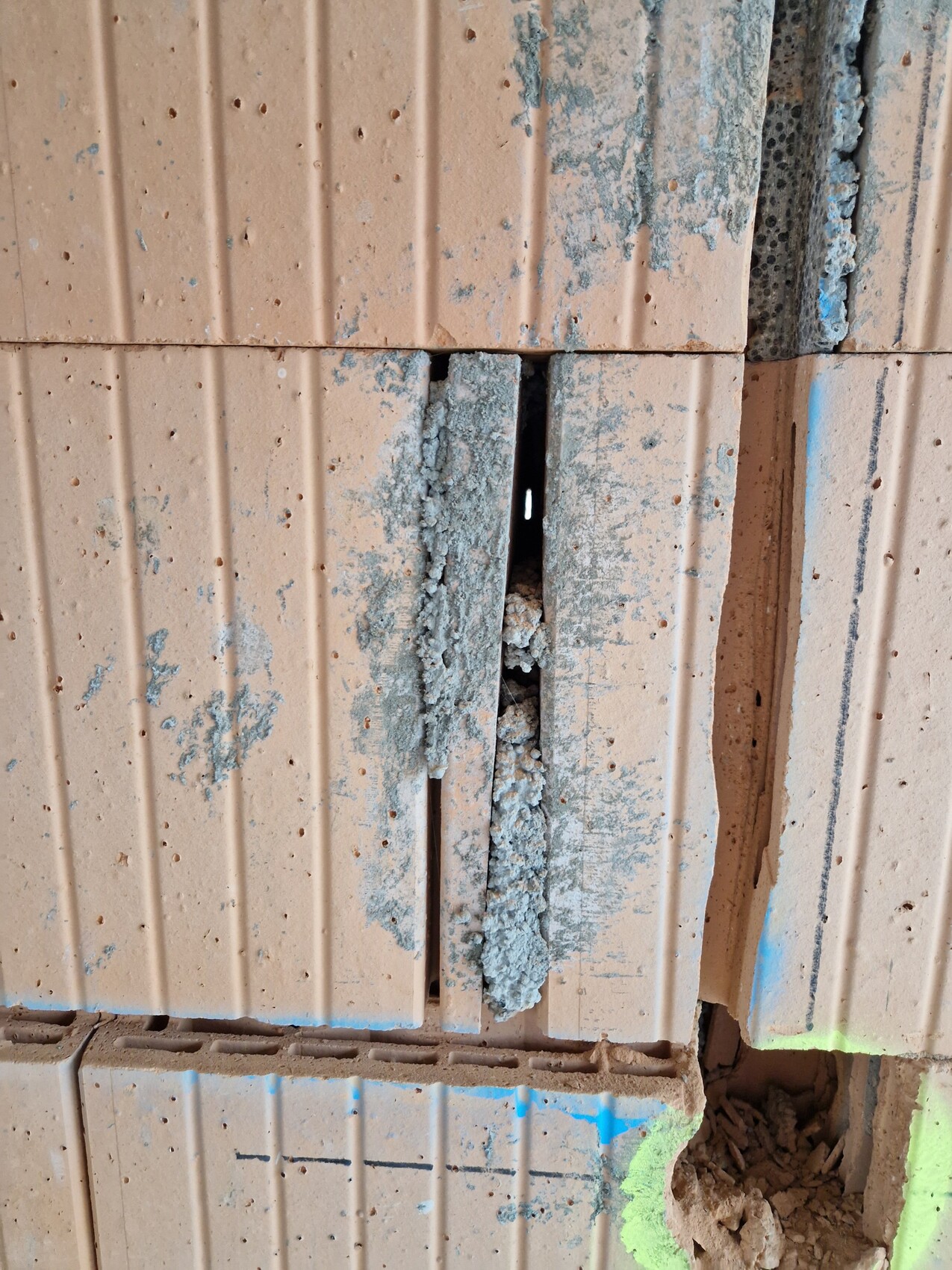 Bei der Kontrolle unseres Rohbaus ist uns erstens eine Lücke bei einer Bohrung für eine Steckdose aufgefallen: Der weiße Spalt im Foto ist der Spalt zwischen zwei Ziegeln, d.h. hier ist direkt eine Lücke nach außen und man merkt einen leichten Zug. Wahrscheinlich wird die Steckdose das ja nicht ganz abdichten. Auch an einer anderen Stelle schließen die Ziegel nicht genau ab und man sieht nach draußen (2. Foto).