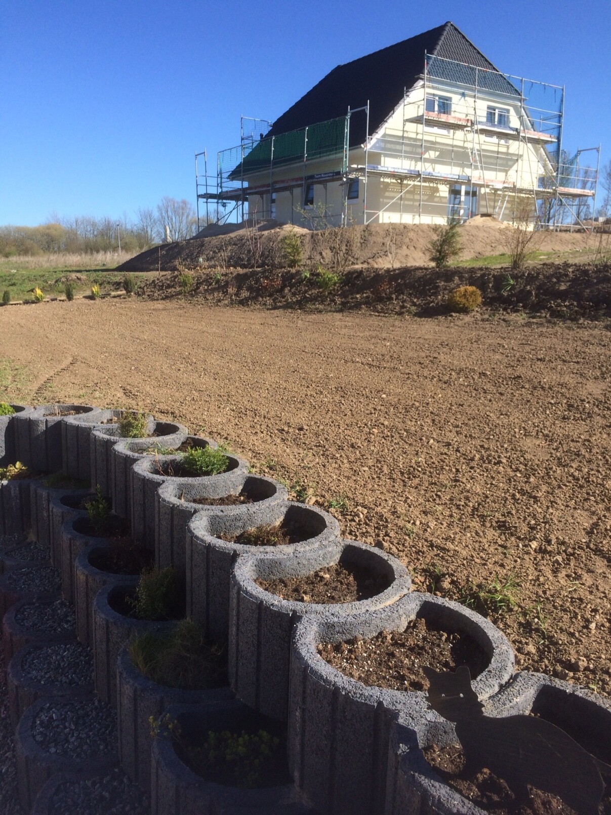 30 Meter Länge und 1,2 Meter Höhe und 2500€ Material kostenWenn es nur das Material wäre. Wir haben Angebote gehabt und keines unter 8k.Nordlys Pflanzringe hatten wir auch überlegt. Unser Boden ist aber recht sumpfig unterhalb der Böschung. Da müssen wir recht viel mit Schotter arbeiten, um ein stabiles Fundament hin zu bekommen. Da kommen wir leider auch über 5k. Und selber machen können wir das nicht. Mein alter Mann hat Rücken (Bandscheiben) und ich darf in den nächsten Monaten nicht schwer heben.
