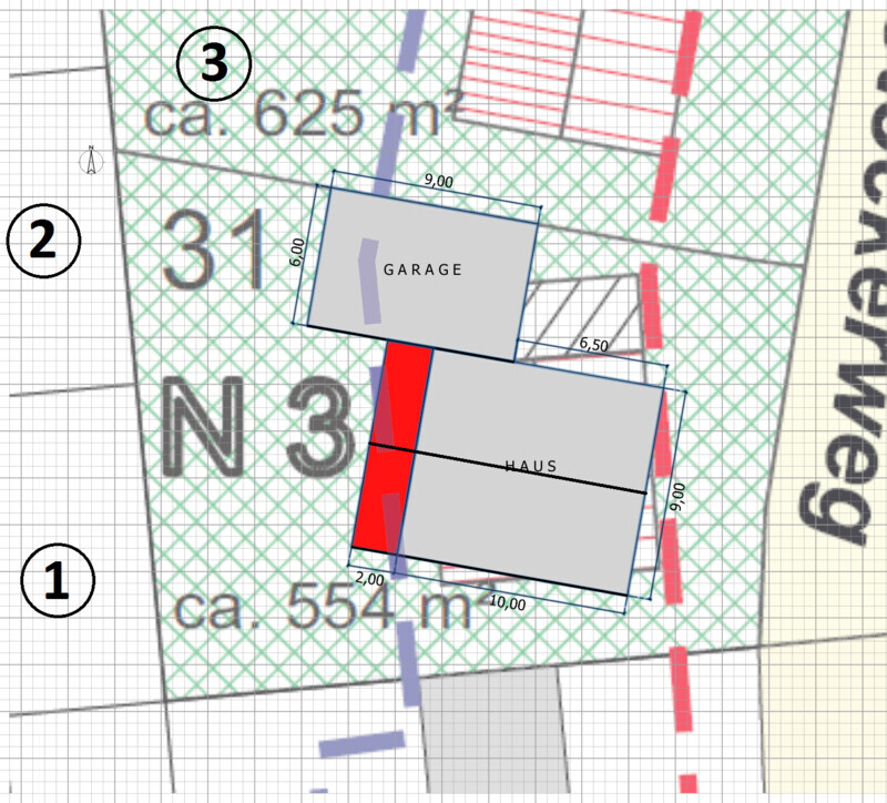 Wegen der Frage warum dieses Grundstück?... warum nicht? Das hängt im großen und ganzen von der Lage und dem Preis ab. Das ausgesuchteHaus wäre unser aktueller Wunsch und ließe sich mit einer Überbauung der hinteren Baugrenze (rotes Dreieck) realisieren, sofern die Nachbarn einverstanden sind. Wir sind aber auch offen für andere Variationen