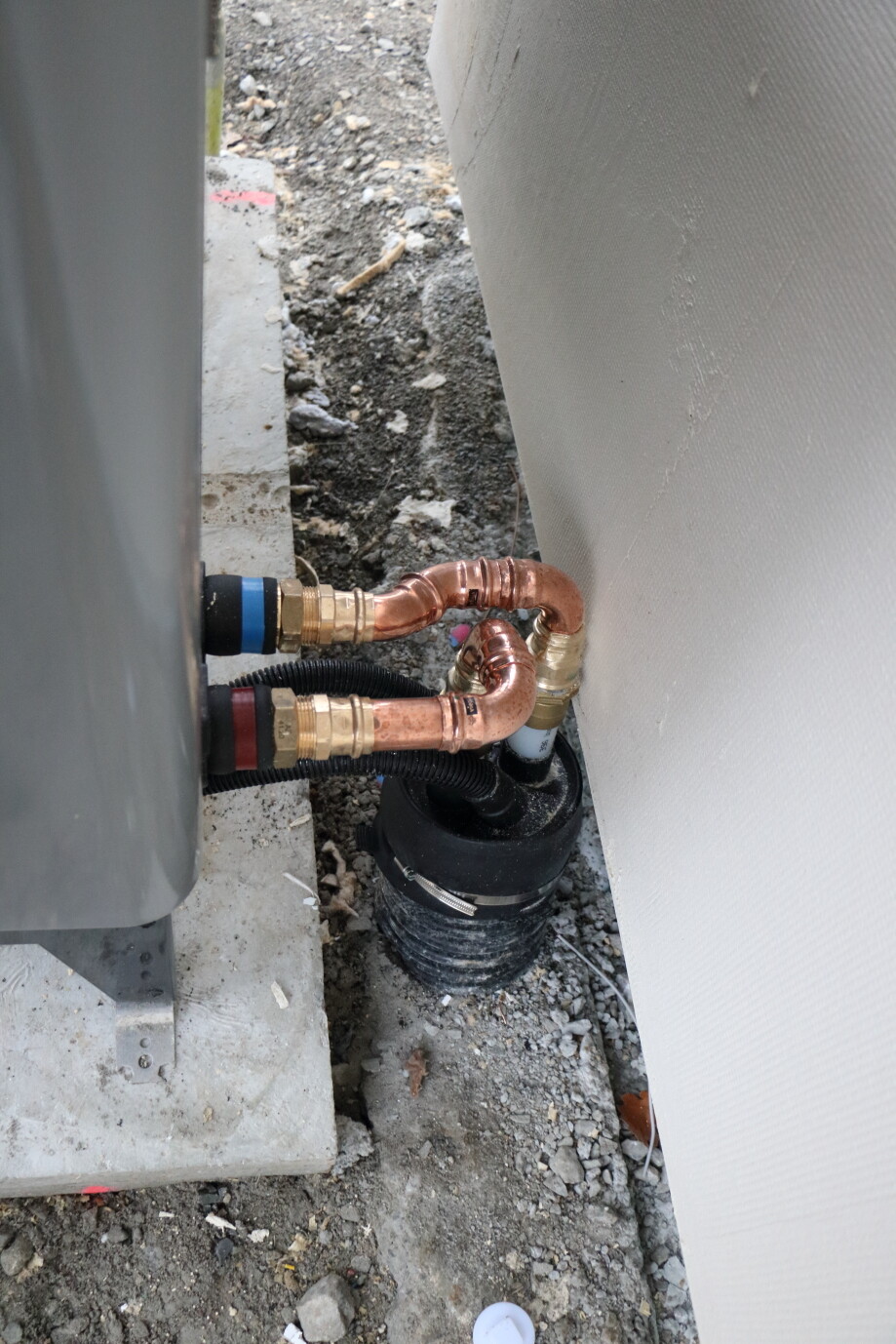 Wir haben unsere Luft-Wasser-Wärmepumpe ebenfalls auf einem Betonfundament. Das war eine Vorgabe des Herstellers. In dem Loch im Fundament ist jedoch die Entwässerung angeschlossen. Das Nahwärmerohr kommt von hinten in die Luft-Wasser-Wärmepumpe. Da das kaum richtig passt beim setzen der Luft-Wasser-Wärmepumpe und das Rohr extrem biegesteif ist, gibt es so Winkelrohre.