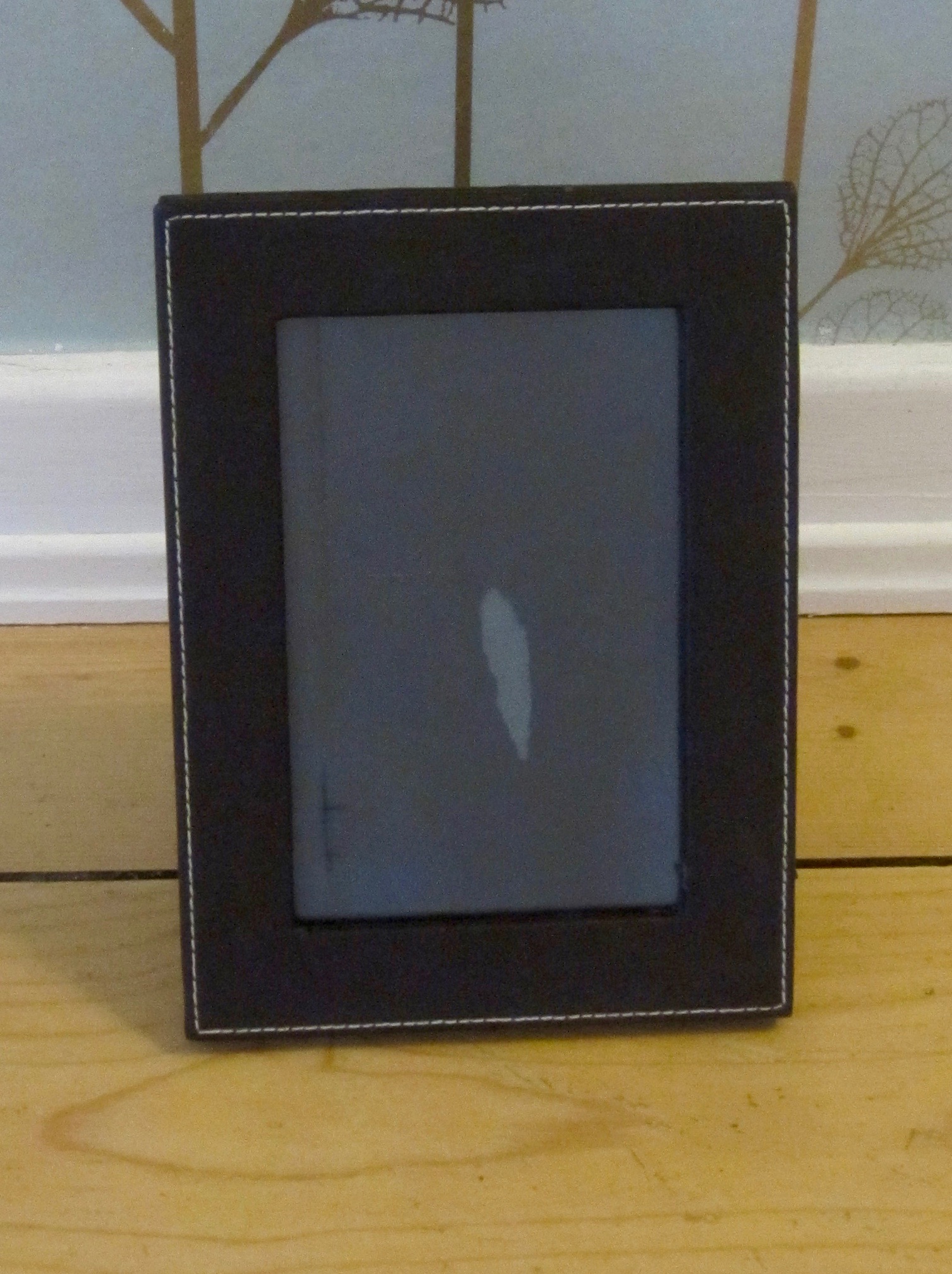 Er ist dunkelbraun, hat vorne rundherum eine weiße Ziernaht, ist zum Aufstellen und magnetisch (die vordere Front lässt sich abnehmen, Foto reintun, wieder zuklappen, fertig).
