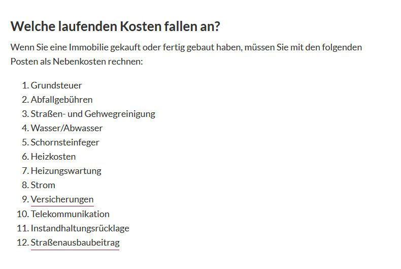 Ich zähle auch Internet+TV zu den Nebenkosten. Sind ja auch Dinge, die jeder hat und die monatlich kosten. Sind bei mir alleine knapp 90,- Euro/Monat.Dann zähle ich auch alles Versicherungen dazu. Und auch die Kfz-Kosten, um vom Haus zur Arbeit fahren zu können. Und noch Kosten für Lebensmittel, denn die bereite ich ja in der Küche zu und esse sie im Essbereich.Das ist alles Unsinn. Hausnebenkosten sind HAUS-kosten. Das Haus kann nichts dafür, dass Du Internet haben möchtest. Aber Grundbesitzabgaben, Strom und Wasser musst Du haben. Nur diese Kosten (u.ä.) zählen dazu.