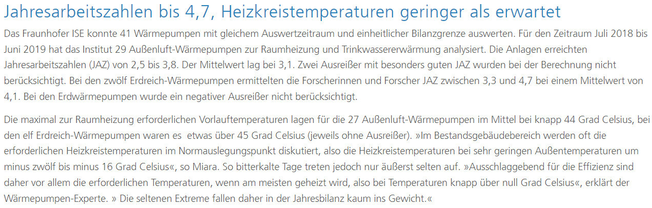 Screenshot eines Artikels über Jahresarbeitszahlen bis 4,7 und Heizkreistemperaturen.