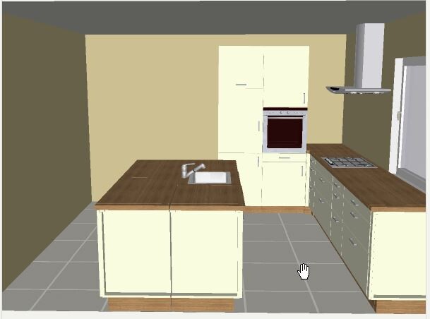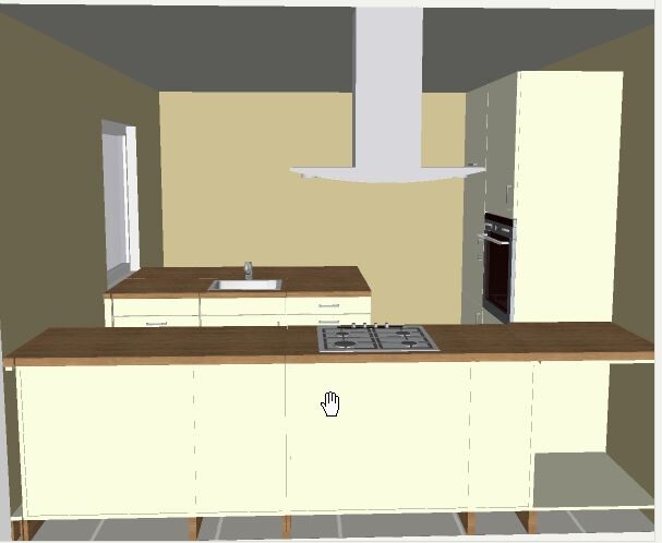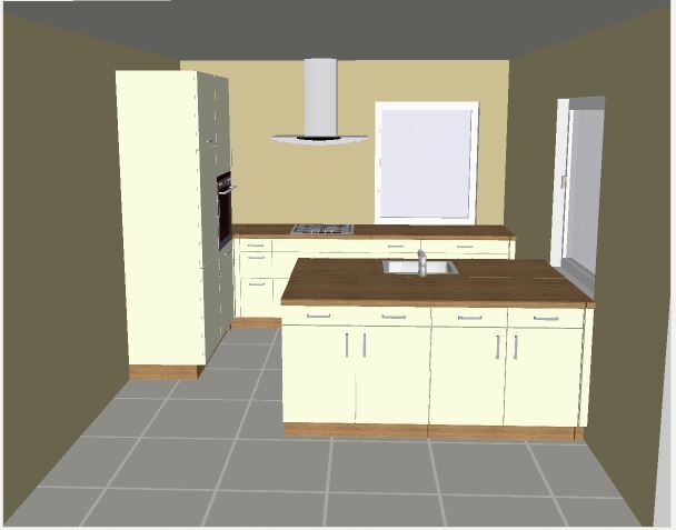 2. Entwurf... Arbeitsfläche (kochen) gewechselt, Tresen gedreht... immer noch Kühlschrank zu weit weg