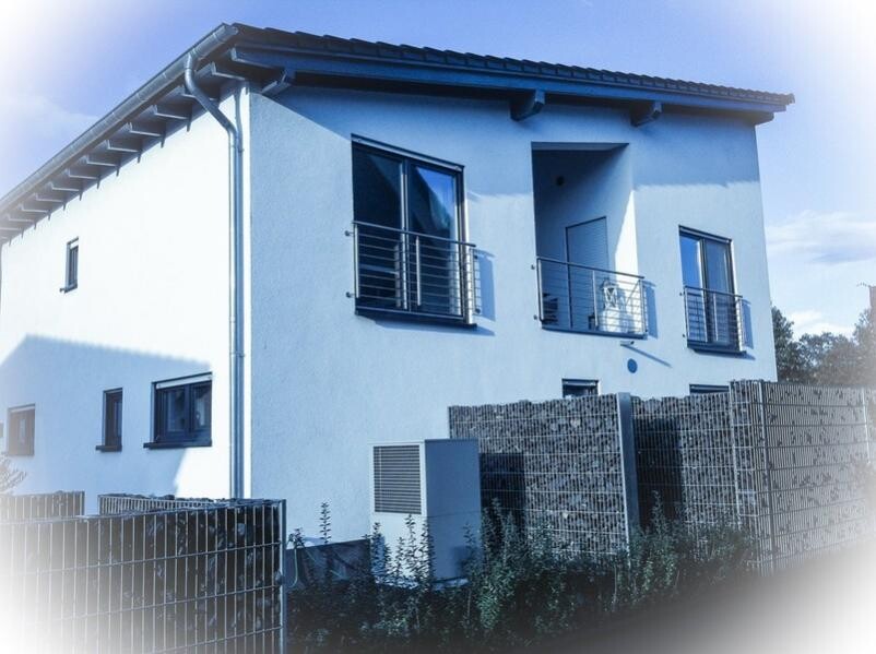 Haus hat zwei Vollgeschosse, weiß mit Anthrazit-farbenen Fenstern und Haustüre. Dach entweder dunkelrot oder auch anthrazit.