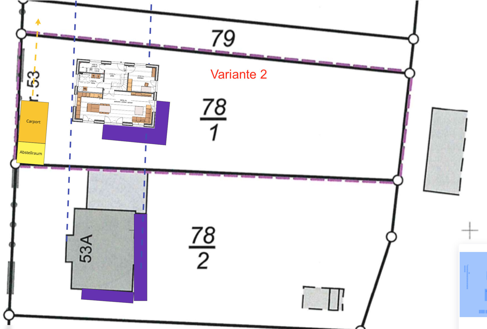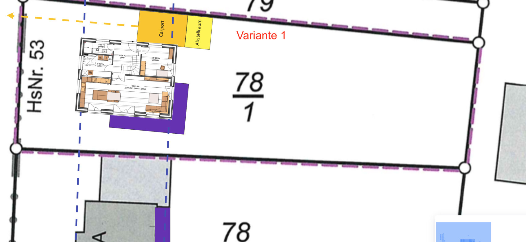 Variante 1: Carport (4x6m) + evtl. Abstellraum (4x3m) seitlich im Norden des Hauses. Einfahrt können wir zu "Hauptstraße" hin realisieren oder evtl. zum Feldweg – müssen wir noch mit der Gemeinde klären.