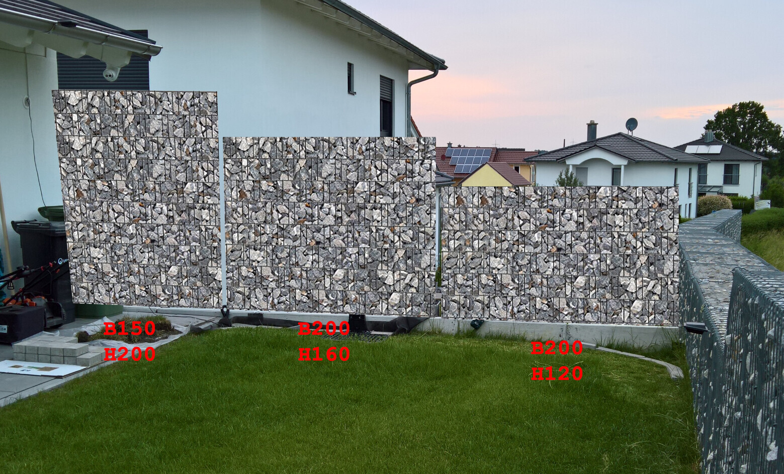 Garten mit dreiteiliger Stein-Gabionenwand vor dem Wohnhaus, Abendhimmel.