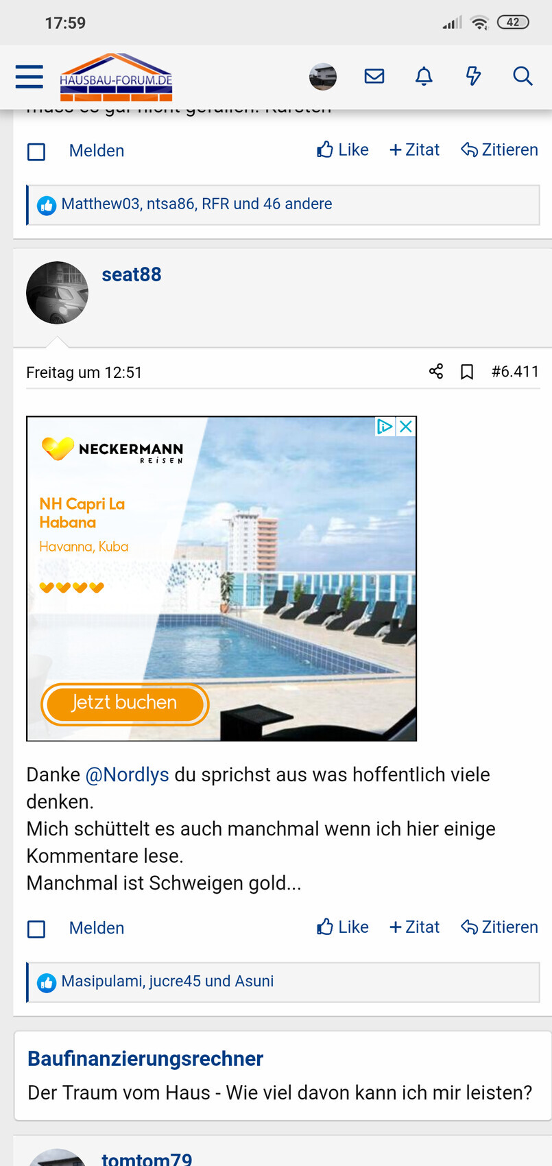 Mobiler Forumsbeitrag im Hausbau-Forum mit Profilbild, Werbebanner und Text