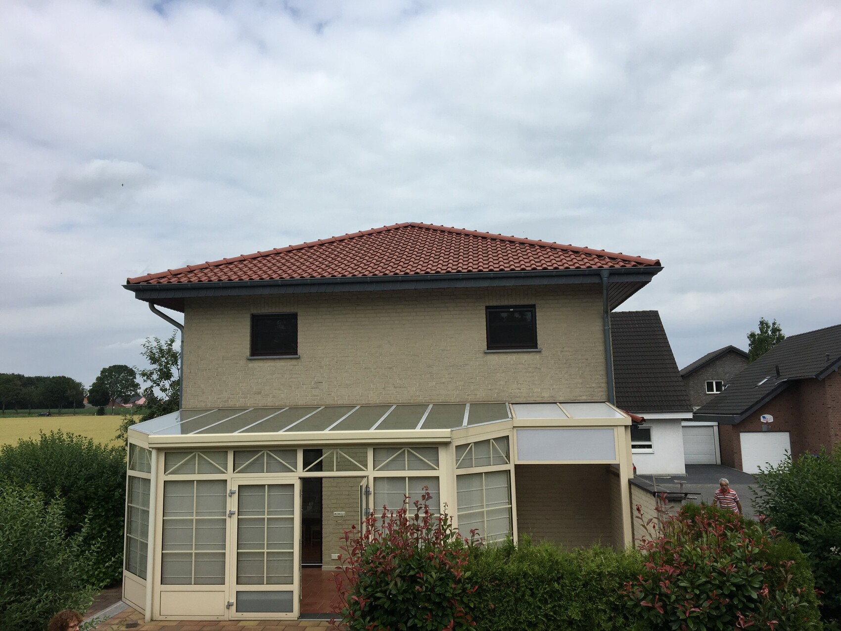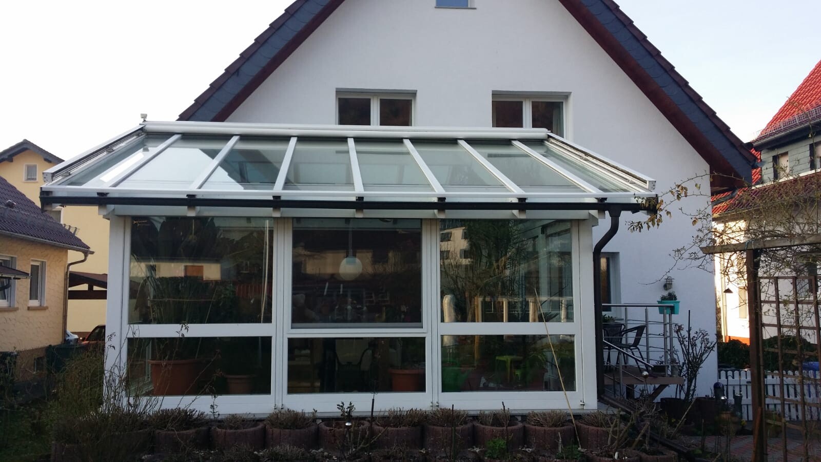 Dazu gehoert ein Wintergarten. leider ohne Markise.