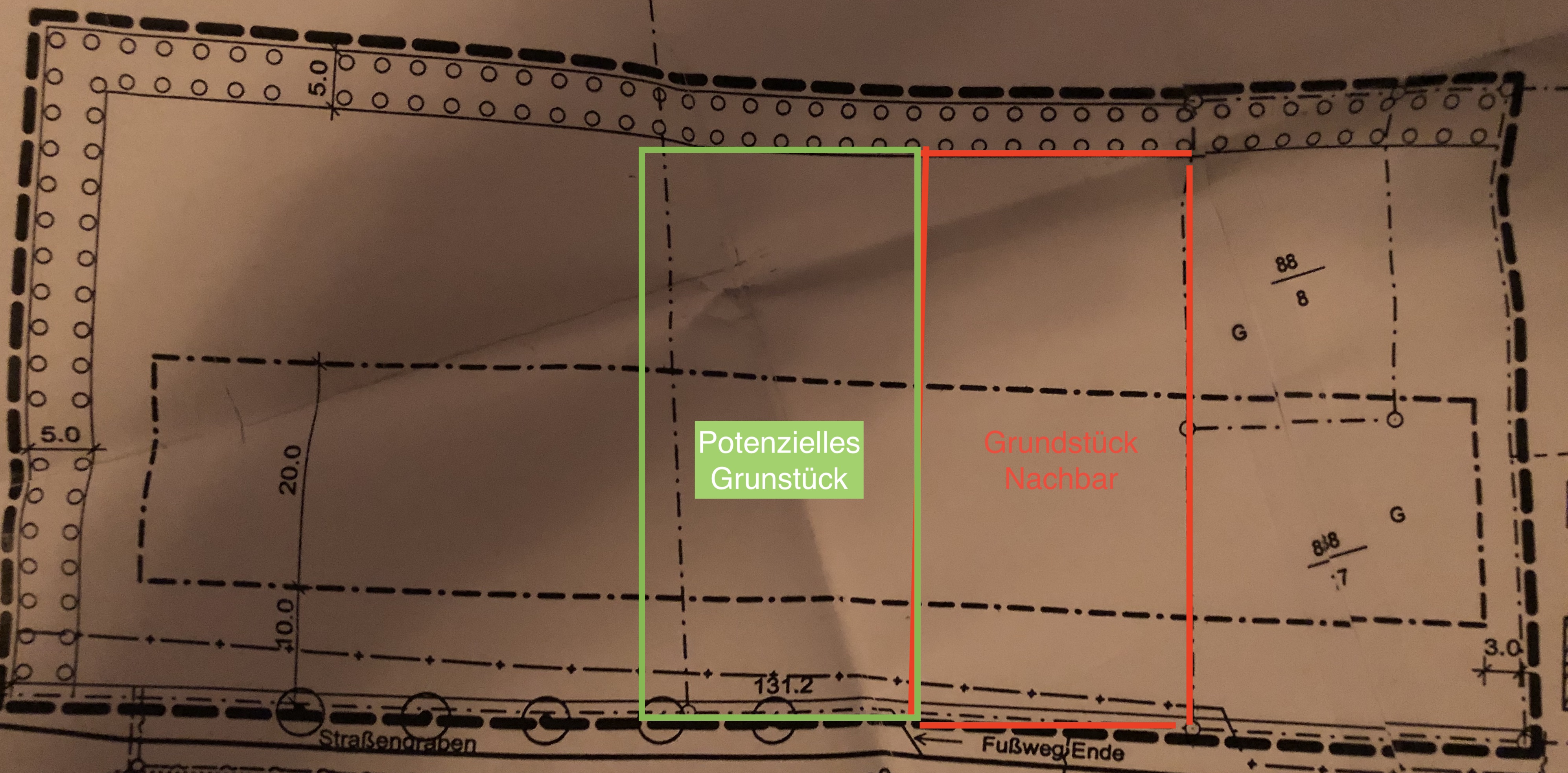 Frag die Gemeinde, frag den Nachbarn; im Zweifelsfalle Du. Wenn Du noch zwei Mitstreiter findest, könnte man dritteln.Natürlich wird der Lageplan nicht vorenthalten - siehe Anhang.