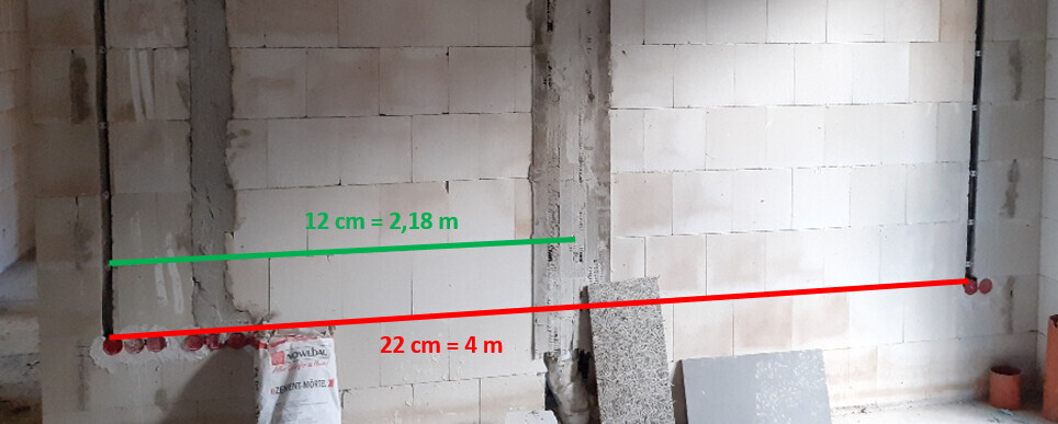 Hier einmal exemplarisch bei einem angenommenen Abstand der beiden linken Steckdosen von 4 m in der Realität und bei einem gemessenen Abstand auf dem Foto von 22 cm, ergäbe sich ein mittiger Abstand zum Fallrohr von der linken Steckdose aus gemessen von 2,18 m. Aufgrund der Perspektive mag es Abweichungen ergeben, ausreichend genau sollte es aber sein.