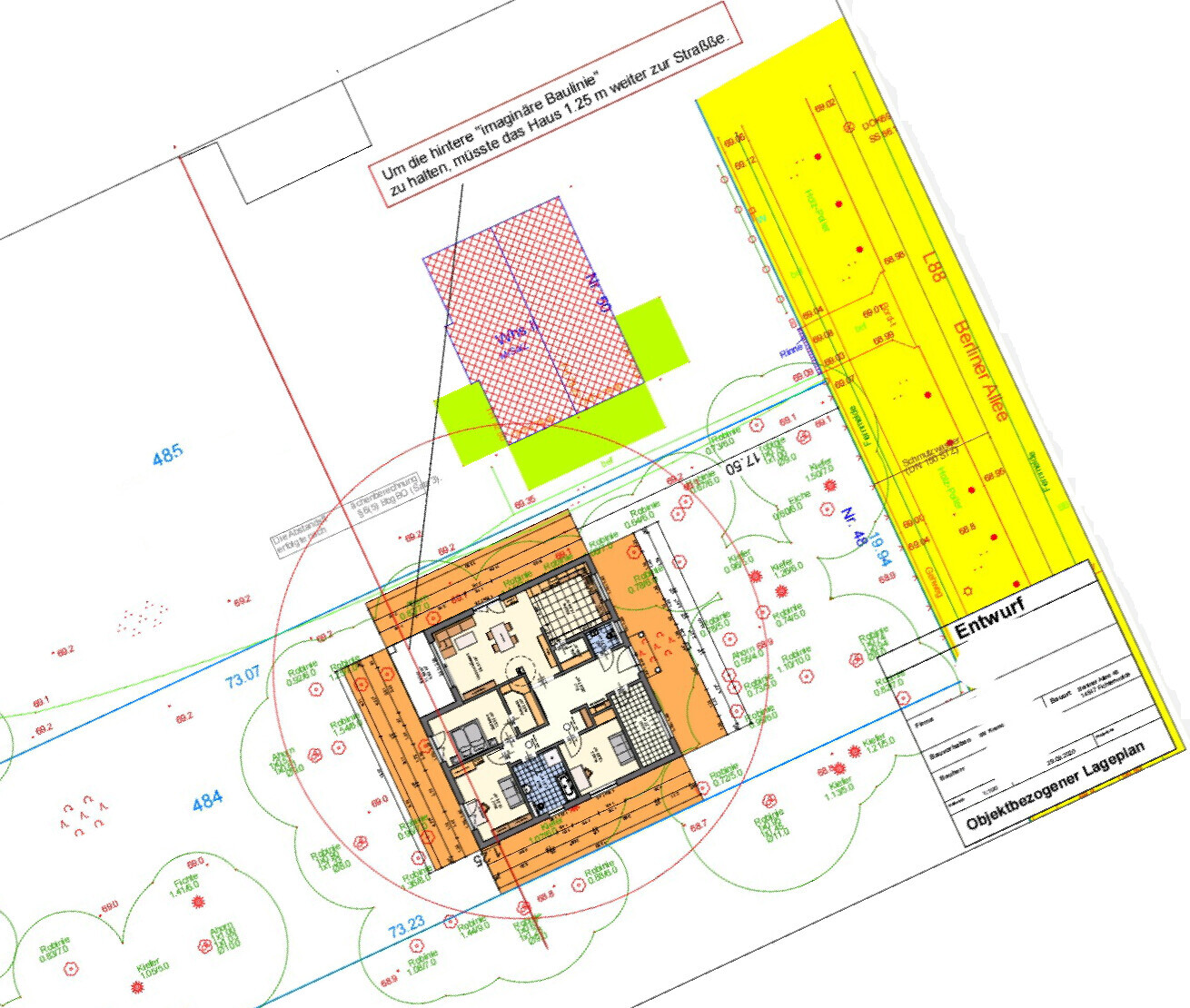 Grundriss eines Gebäudes mit kleinem Garten, umliegenden Bäumen und Bauplan-Details