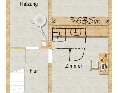 Eine zweite Möglichkeit wäre, dies in den Hobbyraum im Keller zu bauen (ich hab das mal versucht ganz grob einzuzeichnen (Bild 3). Dort gäbe es kein Fenster, dafür aber schon ein waschbecken und daher wohl auch die entsprechenden Anschlüsse. Hier besteht möglicherweise allerdings das Problem, dass man das Wasser aus dem Abfluss etwas hochpumpen müsste, da der Abfluss möglicherweise höher liegt.