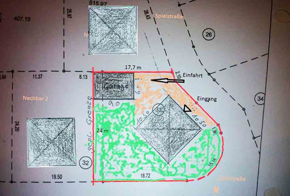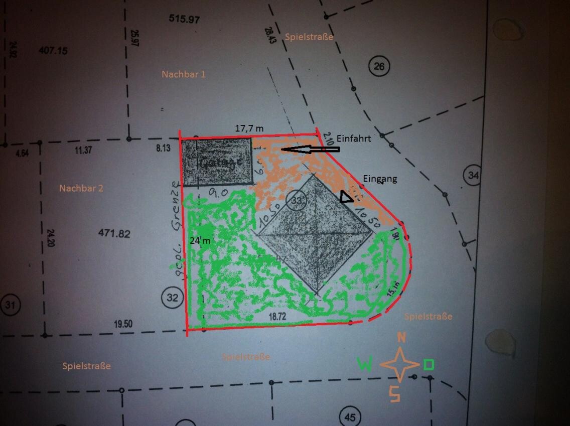 - Von Norden ist leider keine Zufahrt möglich, da NachbargrundstückBezog sich das auf meinen Beitrag? Falls ja meinte ich, daß die Garage in die Ausbuchtung des Grundstücks kommen könnte, mit einer Zufahrt da wo jetzt der Eingang geplant ist. Dazu ein schmaleres, längeres Gebäude im Norden = Garten im Süden.